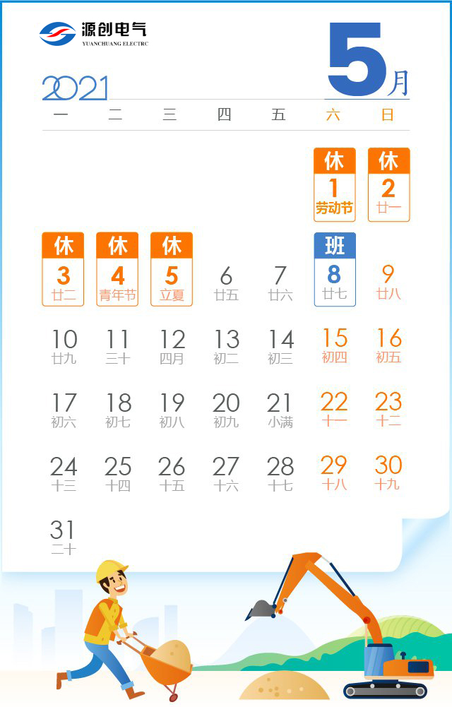 5月1日至5日放假調休,共5天。4月25日(星期日)、5月8日(星期六)上班