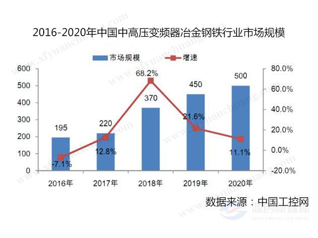 中高壓變頻器在冶金鋼鐵行業的應用分為前端和后端二部分。前端主要用于燒結主抽風機、煉鐵環節引風機、循環風機、高爐風機等;后端主要有板材和線材的軋機、卷取機、風機、料漿泵等,主要以電機節能為目的。2020年冶金鋼鐵行業中高壓通用變頻器市場規模為5億元,市場體量較大,前景較為廣闊。