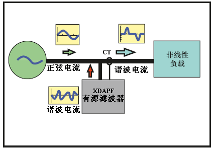 XDAPF通過外部CT測量負(fù)載電流或電網(wǎng)電流送到信號板進(jìn)行處理,控制板完成負(fù)荷諧波電流的計算和諧波電流補(bǔ)償?shù)拈]環(huán)控制,并產(chǎn)生PWM驅(qū)動信號到驅(qū)動板,驅(qū)動板驅(qū)動逆變器的IGBT從而將所需的補(bǔ)償電流輸出到電網(wǎng),完成諧波濾除的功能。