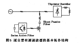 圖5所示為混合型濾波器,它是有源濾波器和無源濾波器的組合結(jié)構(gòu)。這種濾波器結(jié)構(gòu)目前非常普遍,因?yàn)樗⒙?lián)的LC無源濾波器部分消除了大量的低次諧波,因而有源濾波器部分容量可以做到很?。ㄘ?fù)荷容量的5%左右),這樣大大減少了有源濾波器的體積和成本。它可以同時消除電壓和電流諧波,而且成本相對來說較低,因而非常受歡迎。但是這種結(jié)構(gòu)的濾波器的缺點(diǎn)在于只能針對特定負(fù)荷進(jìn)行補(bǔ)償,負(fù)荷運(yùn)行狀況變化較大的時候補(bǔ)償性能不好。
