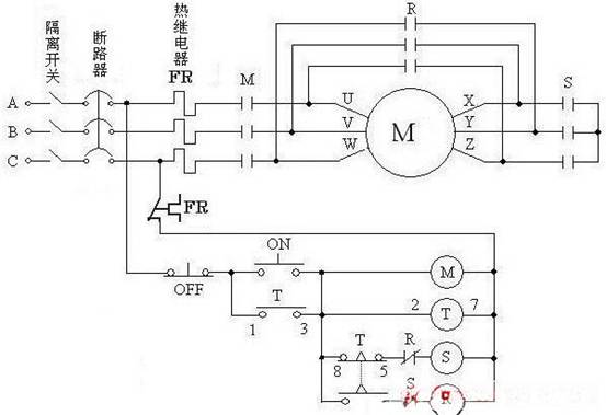 合上隔離開關---合上斷路器----按下ON啟動按鈕---M,S,T得電---M接通主回路,S通過T的常閉觸點及R的常閉觸點得電---S主回路接通--正在做起動運轉過程。