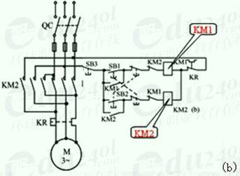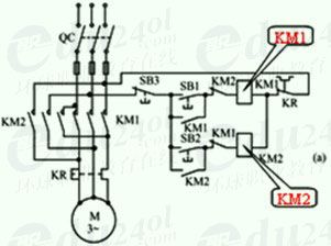 為此,只要用兩個交流接觸器就能滿足這一要求,當正轉接觸器KMI工作時,電動機正轉;當反轉接KM2工作時,由于調換了兩根電源線,所以電動機反轉。