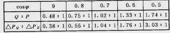 得知當電網(wǎng)結(jié)構(gòu)固定,輸送的有功功率一定時ΔP∑的大小取決于Q的變化,即與Q的平方成正比。下面的表格表示了不同負荷功率因數(shù)下,電網(wǎng)需要輸送的Q造成ΔP∑的變化。